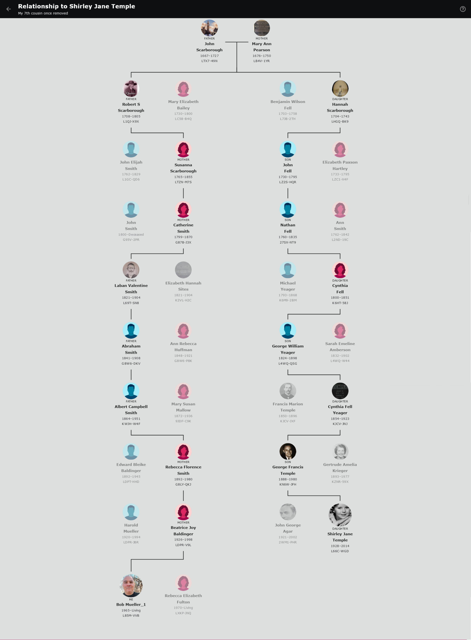 I clicked through just to explore the connection, and . . . it makes sense. FamilySearch claims Temple is my 7th cousin once removed, meaning we share a set of great-great-great-great-great-great-great-grandparents. I’ve only definitively traced things back to Laban Smith, my 3x great-grandfather on my mom’s side. The FamilySearch page goes back another four generations and I’ve not had the time to research anything there. But the names and dates seem to make sense.