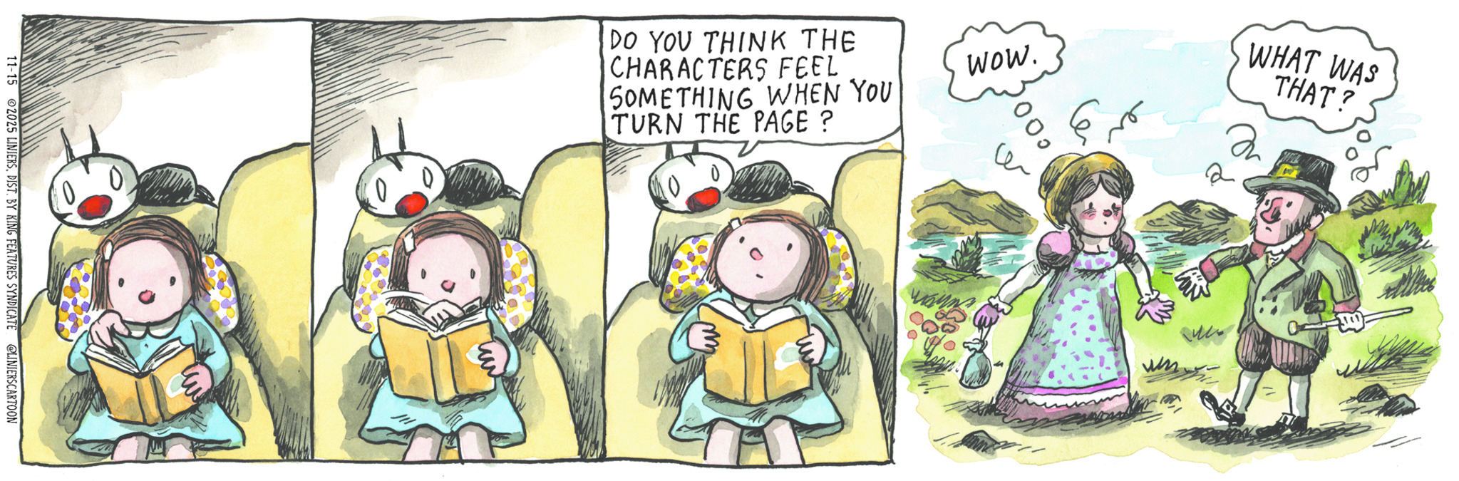I subscribe to a bunch of comics at Comics Kingdom, and one of my favorites is Macanudo, drawn by Liniers. Saturday’s comic amused me.