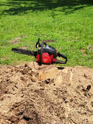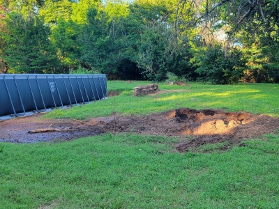 So the big stump is gone, and I took care of four smaller stumps around the property. Now we need to level the spot for the smaller pool, possibly compact that ground, and we can get it set up early next week.