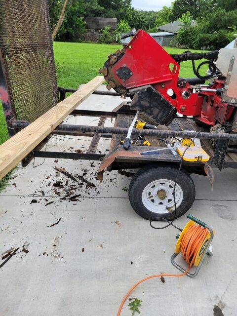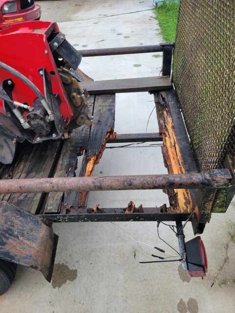 Several pieces of the trailer deck crumbled away as the rental company loaded the grinder, so before I could unload it at the house, I had to run to Lowe’s to get lumber. We knew we needed to replace the deck; we were hoping to wait a little longer though.